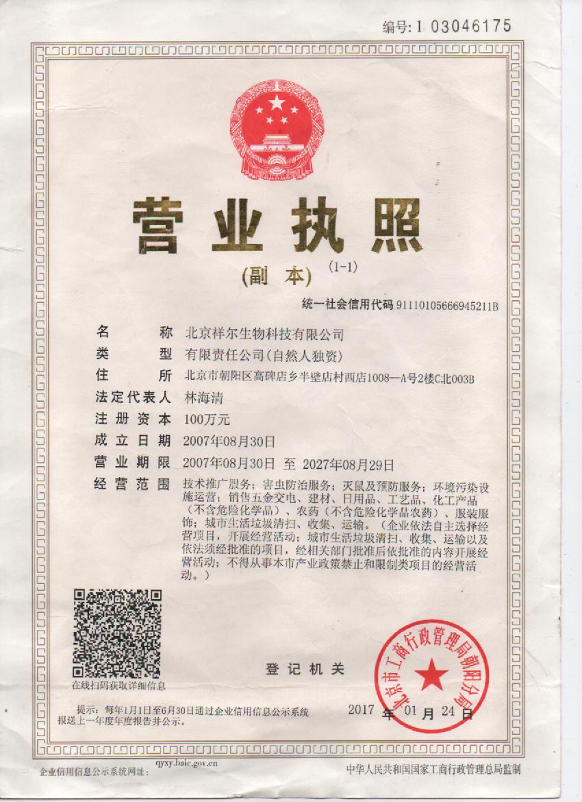 北京祥爾生物科技有限公司是經(jīng)過全國(guó)衛(wèi)生產(chǎn)業(yè)企業(yè)管理協(xié)會(huì)有害生物管理協(xié)會(huì),北京市愛衛(wèi)會(huì)登記備案、有害生物防治協(xié)會(huì),北京室內(nèi)及車內(nèi)環(huán)境凈化協(xié)會(huì)、公共環(huán)境消毒殺菌服務(wù)企業(yè)資格證書單位,審核成立的為客戶解決生產(chǎn),服務(wù)過程中有關(guān)城市害蟲、衛(wèi)生環(huán)境(蒼蠅、蚊子、蟑螂、老鼠、螞蟻、臭蟲等害蟲以及公共環(huán)境消毒衛(wèi)生服務(wù))防控問題而設(shè)立的專業(yè)技術(shù)服務(wù)機(jī)構(gòu),目前在北京、河北、內(nèi)蒙古、遼寧、吉林等地共設(shè)有6家分公司,所有員工均勻從業(yè)資格證、健康證、學(xué)歷證書。公 司成立于2003年擁有近20年的消殺經(jīng)驗(yàn)一支資深有害生物防治專家和消殺顧問、高素質(zhì)的、專業(yè)人員并且以服務(wù)快捷、高效、嚴(yán)謹(jǐn)作為服務(wù)宗旨的團(tuán)隊(duì)。